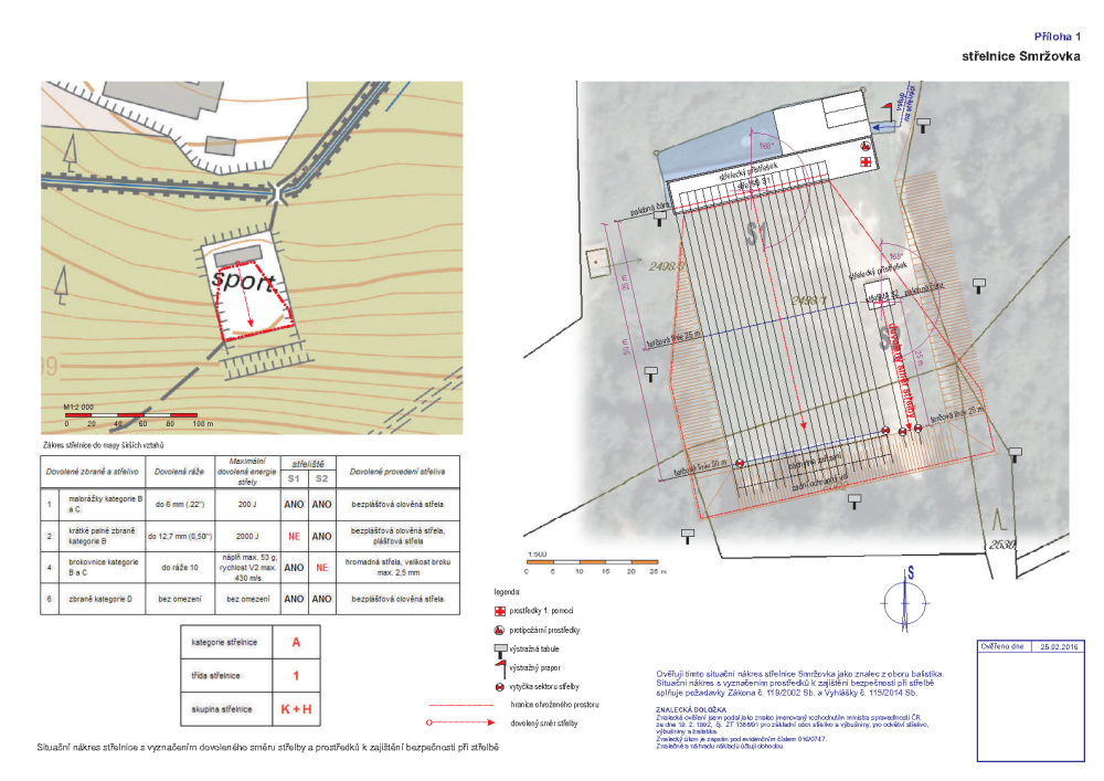 - Střelnice je určena ke střelbě z krátkých kulových palných zbraní, malorážek a brokovnic kategorie B, C a D. Je tvořena dvěmi střelišti označenými S1 a S2.